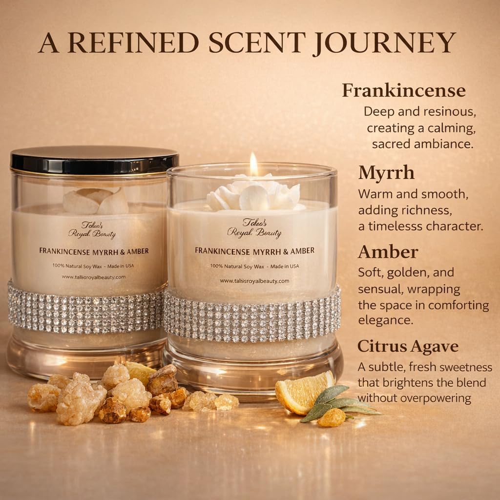 Luxury Soy Candle - Frankincense Myrrh, Amber & Citrus Agave | 11 oz | Handcrafted by Tchio’s Royal Beauty – Elegant Glass Jar with Gem Wrap | Long-Lasting, Natural Aromatherap, Gifting, Wedding