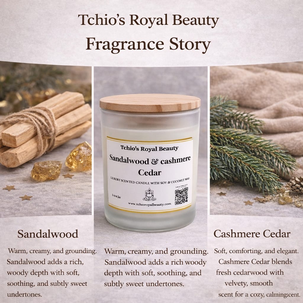 Indulge your senses with the calming blend of Sandalwood and Cashmere Cedar from Tchio’s Royal Beauty. This 14 oz luxury candle is hand-poured using a clean-burning soy and coconut wax blend, designed to fill your space with a warm, comforting aroma. Housed in an elegant jar with a natural wooden lid and featuring two cotton wicks, it offers a balanced, even burn and a rich fragrance throw—perfect for creating moments of relaxation and indulgence.